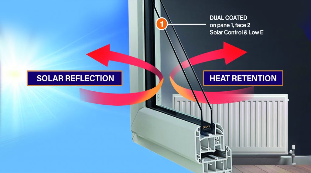 Custom Ambient which has an unbeatable U value of 1.0, has a dual coating on the inside of the double glazed unit (face 2), consisting of a solar control coating plus a low-e coating. The solar control coating reflects the suns rays away from the window, which keeps the room cooler in summer. The low-e coating reflects the heat generated by radiators back into the room, keeping it warmer in Winter.